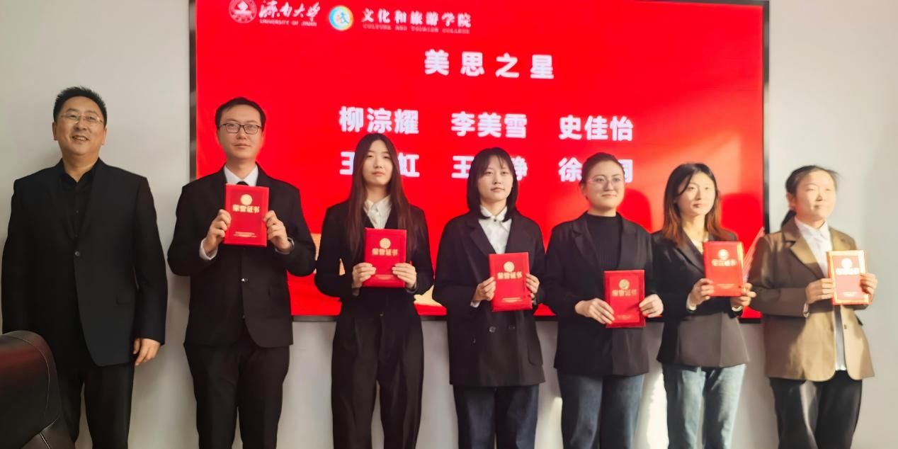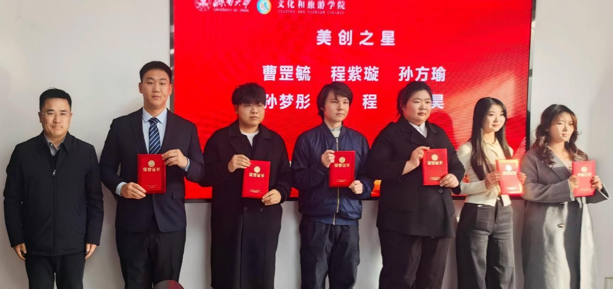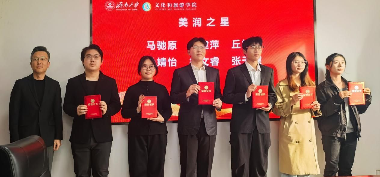 首届“四美之星”表彰决定》。学校党委常委、宣传部部长卢旺,学校学生工作处处长胡春毅,学校团委书记李书翔,学院副院长马修伦分别为“美思之星”“美润之星”“美创之星”“美善之星”获奖学生代表颁奖。获奖学生代表刘炳玺同学上台发言,分享了其在美育熏陶下成长的心得体会,表达了对学校、学院培养的感激之情以及继续砥砺前行的决心。