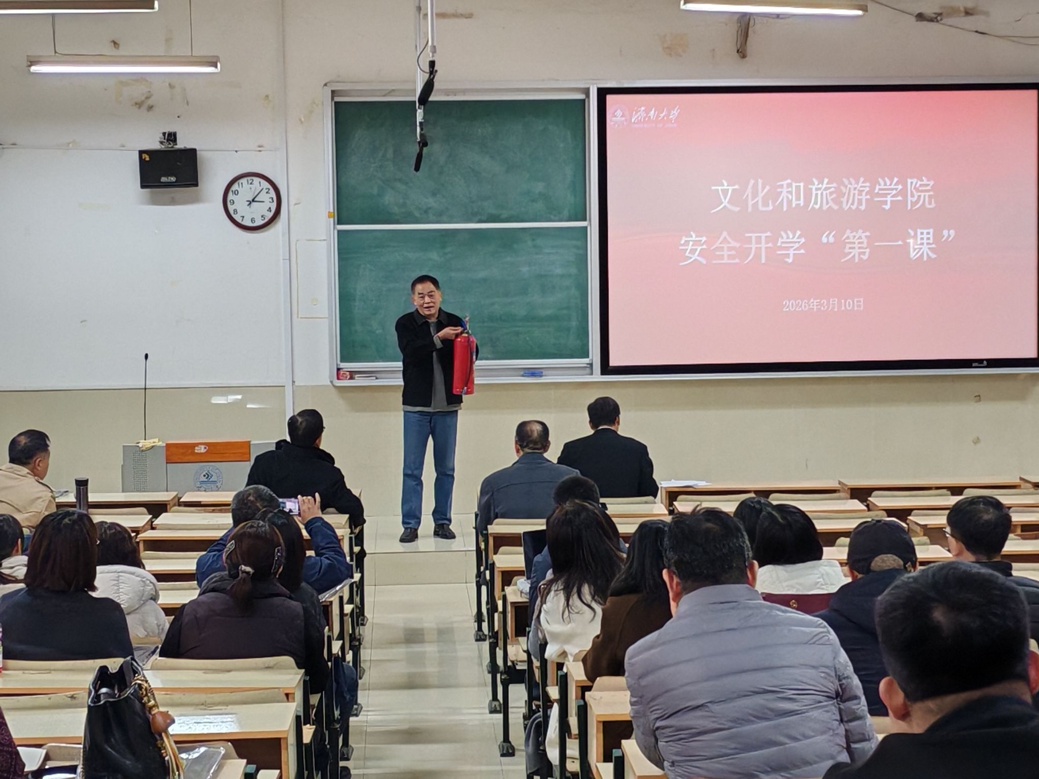 同时,学院开展了安全开学“第一课”活动,邀请了学校保卫处张韶春科长进行了现场教学活动,系统讲解了灭火器的使用方法,并讲授安全防火基本知识,张韶春科长强调了安全防范工作的重要性,希望大家要领会把握应知应会的防范技能,遵守安全规定,提高防范意识。孟德洋强调安全稳定是学院发展的根本前提,要求全院师生扎实开展安全开学“第一课”各项工作,从严从细落实安全责任,全力保障新学期开学平稳有序、校园安定祥和,他要求全体教职工要同心同德、真抓实干,以实干担当推动学院工作提质增效、再上新阶。