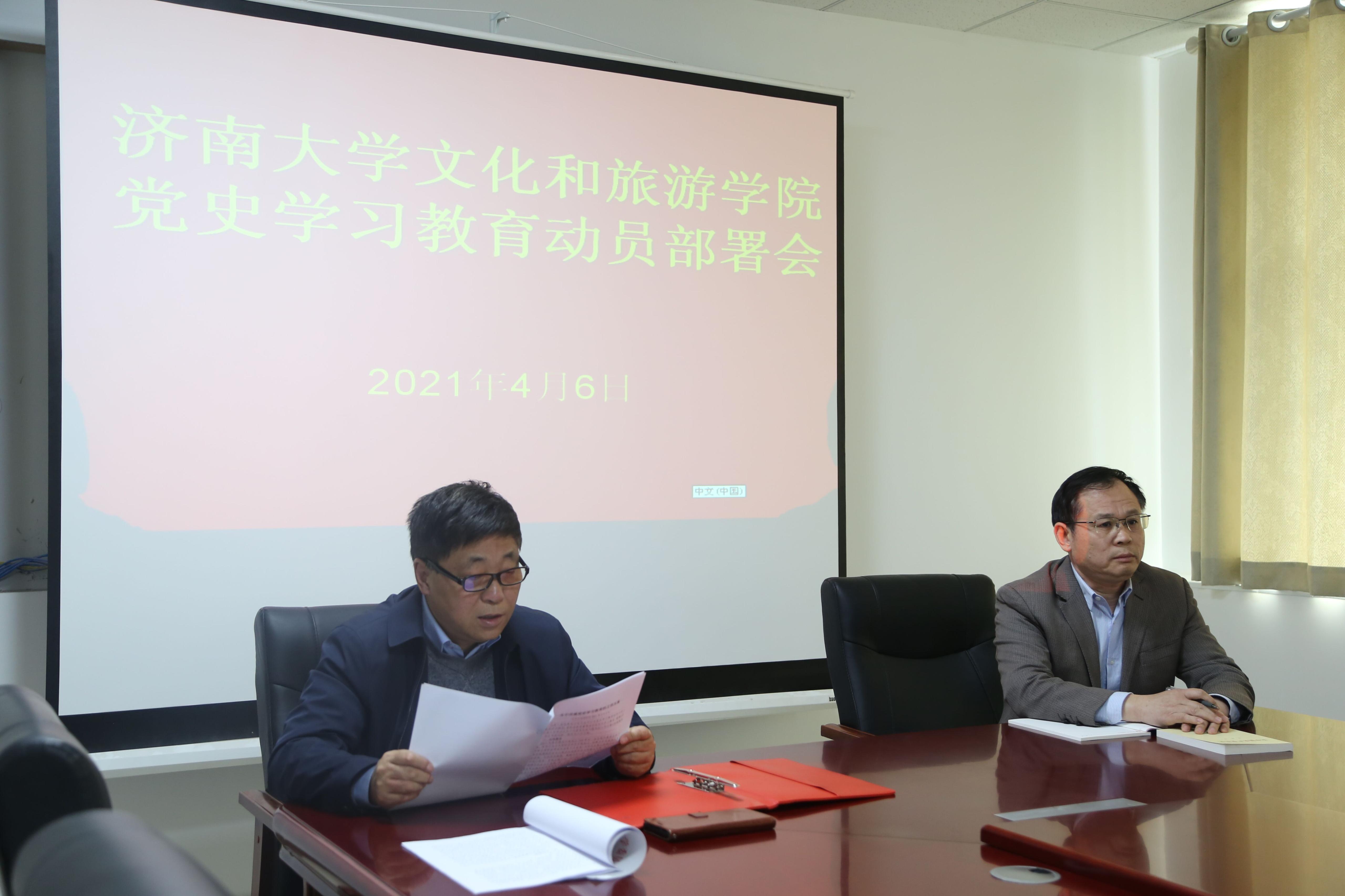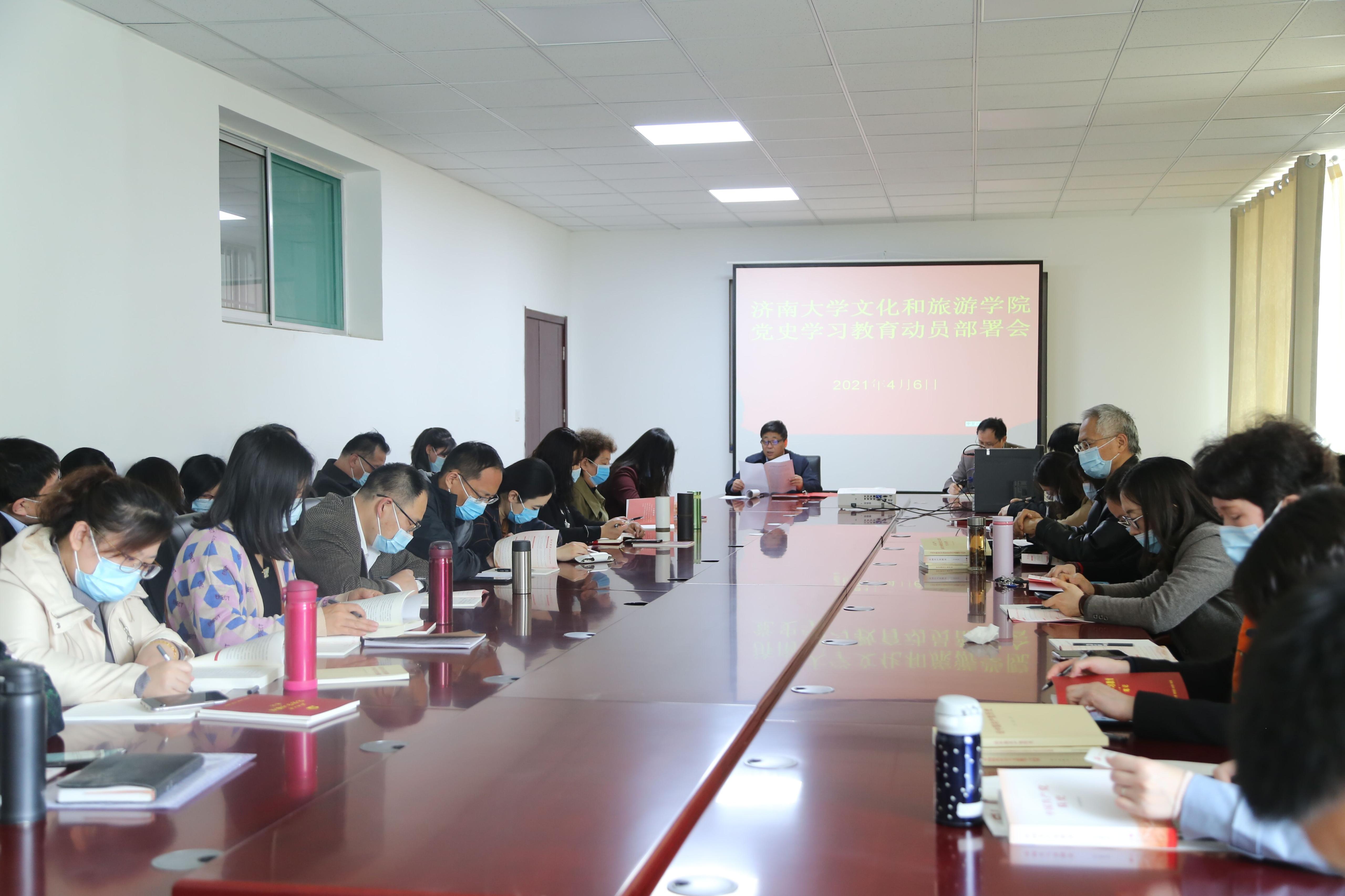 舜耕校区文旅楼212会议室举行“党史学习教育”动员部署会。会议由学院党委书记朱海涛主持,院长刘建波和全体教工党员参加。
