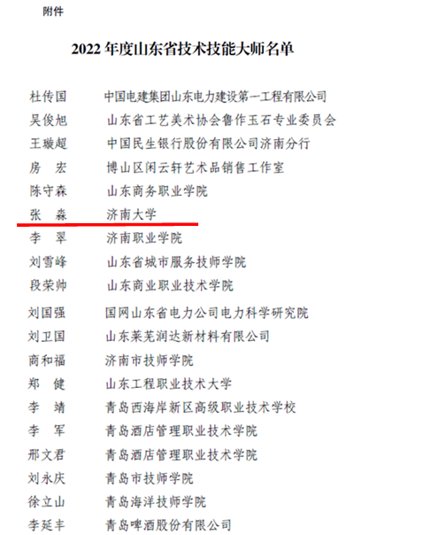 烹饪与营养教育专业张淼老师榜上有名,荣获2022年度山东省技术技能大师称号。