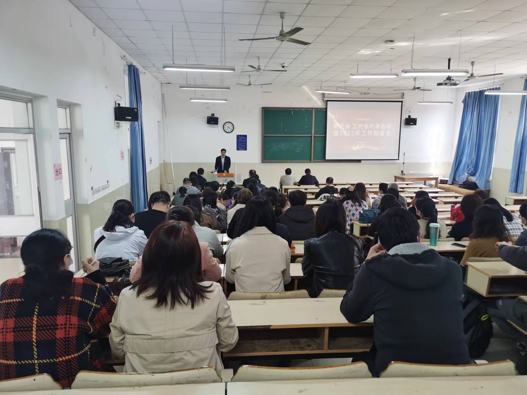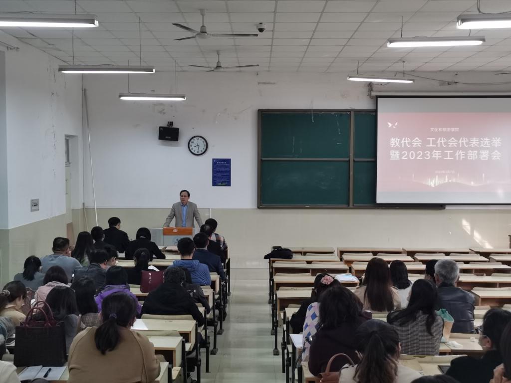 在舜耕校区文旅楼报告厅召开全体教工大会,学院全体领导、老师们参加会议,会议由副院长张炳文主持。