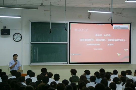 9月19日晚,学院党委书记孟德洋以《身未动,心已远,做新时代的文旅人》为主题,为学院2023级364名本科新生讲授“开学第一课”。