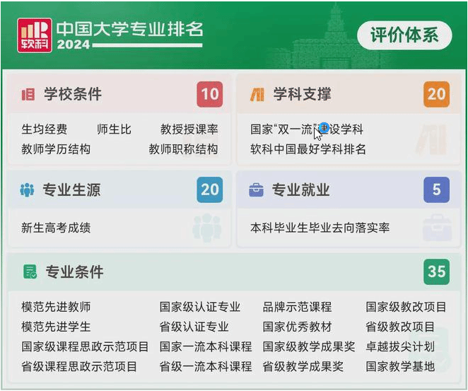 排名指标体系设置包括:学校条件、学科支撑、专业生源、专业就业、专业条件 5个指标类别,共25项测量指标。