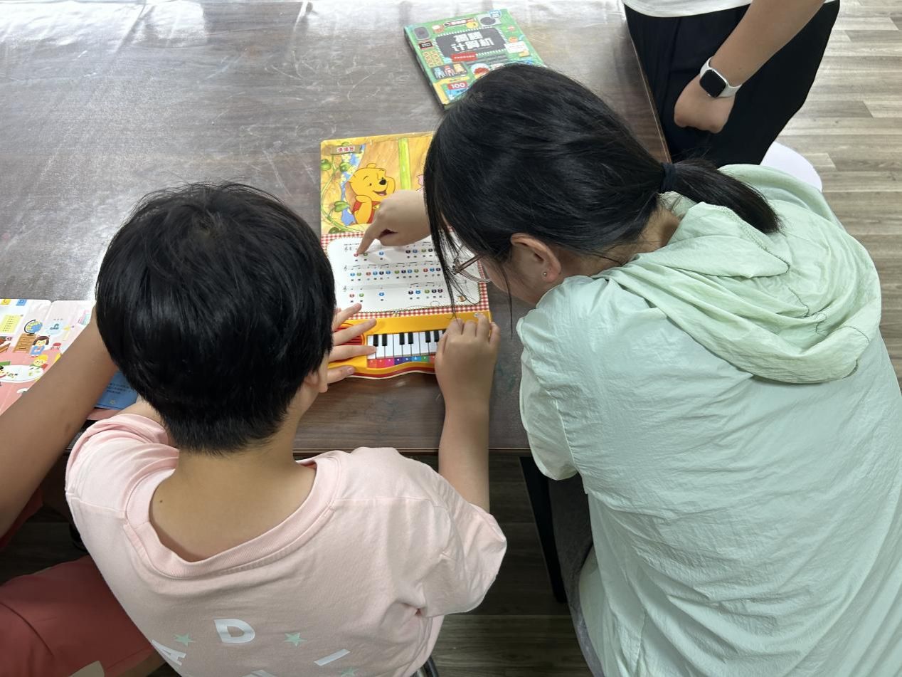 图书角里,一场融合多元感知的读书陪伴正在进行。团队成员拿起特制绘本,引导孩子们触摸立体模型认知事物,轻按书页上的钢琴键感受音乐韵律。有的孩子指着立体动物模型轻声跟读,有的跟着钢琴键发出的旋律轻轻拍手,每一个细微的反应都让团队成员们欣喜不已。这段书香与音符交织的时光,为孩子们打开了一扇认知世界的小窗,也让知识的种子在陪伴中悄悄萌芽。