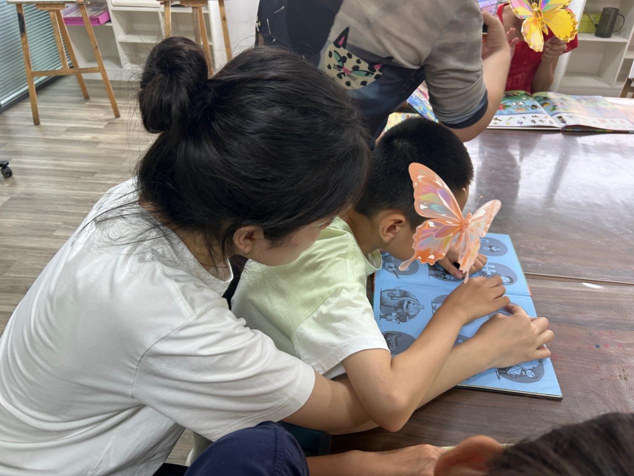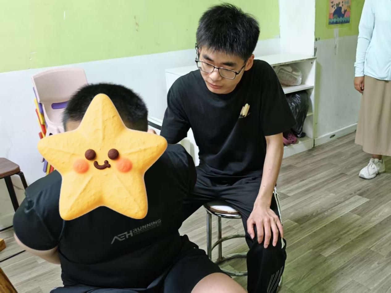 康复中心的课堂上,团队成员化身为“同行者”,全程参与孩子们的学习时光。认知课上,队员程明菲与孩子并排而坐,跟随老师的引导共同感知身体的存在;讨论环节,队员李雨薇耐心倾听孩子的想法,用鼓励的话语引导思考;观看动画片时,队员黄艺琛和孩子一起欢笑,适时讲解画面里的故事。当孩子因为难题皱眉时,队员轻轻点拨思路;当孩子主动分享见解时,队员及时送上肯定的掌声。课堂上的并肩同行,不仅为孩子们的学习增添了助力,更让他们在互动中感受到平等与尊重,让成长的每一刻都充满温暖的陪伴。