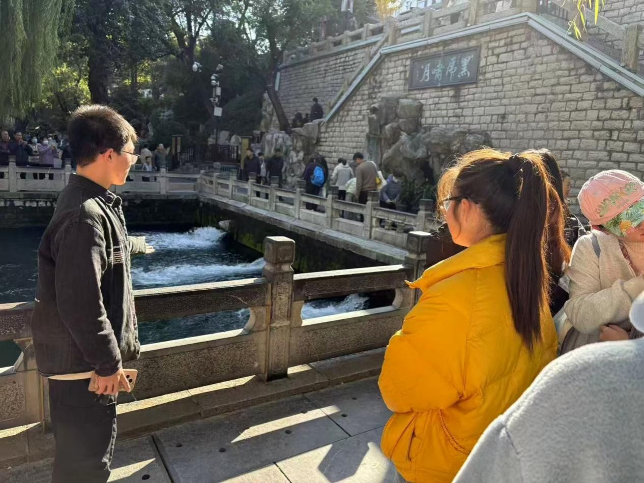 活动第一站是黑虎泉,师生们阅读《济南泉水志》与老舍《济南的冬天》选段后,带着“泉水如何塑造济南性格”的疑问走进泉边。同学们听着三兽首喷涌出的“哗哗”泉声,触摸岩溶裂隙水带来的清凉,看到市民提着水桶排队打水的日常场景,直观理解了老舍笔下“泉水是济南的灵魂”的深刻内涵。现场还设置“图文转换”环节,大家用镜头记录晴天泉泛金光、泉边市井烟火的画面,将文字中的“泉水记忆”转化为鲜活影像。