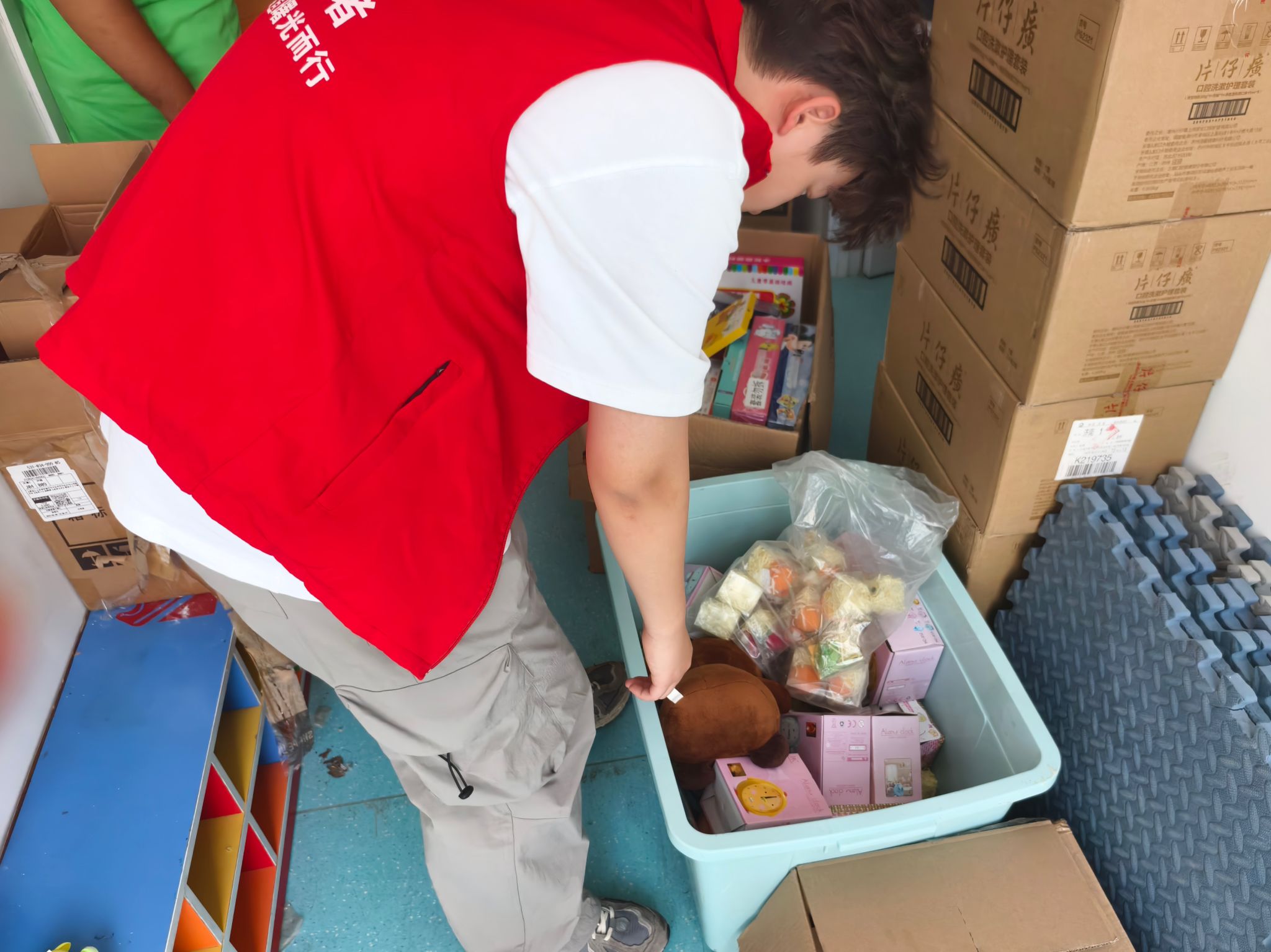 在室内装修如火如荼进行的同时,另一组志愿者们开启了杂物整理的“空间魔法”。他们细致地穿梭于各个房间,将杂物分类为可回收物、不可回收物和有害垃圾。旧衣物、饮料瓶等可回收物品,在志愿者们的协调下找到了新的归宿;不可回收垃圾也被妥善装袋,等待专业处理。志愿者们还充分利用收纳盒、置物架等工具,为康复中心规划出合理的储物空间。原本堆满杂物的角落,在他们的巧手下变得干净整洁、井然有序,空间也因此显得更加宽敞明亮,仿佛一场关于生活的蜕变,让整洁与美好重新回归。