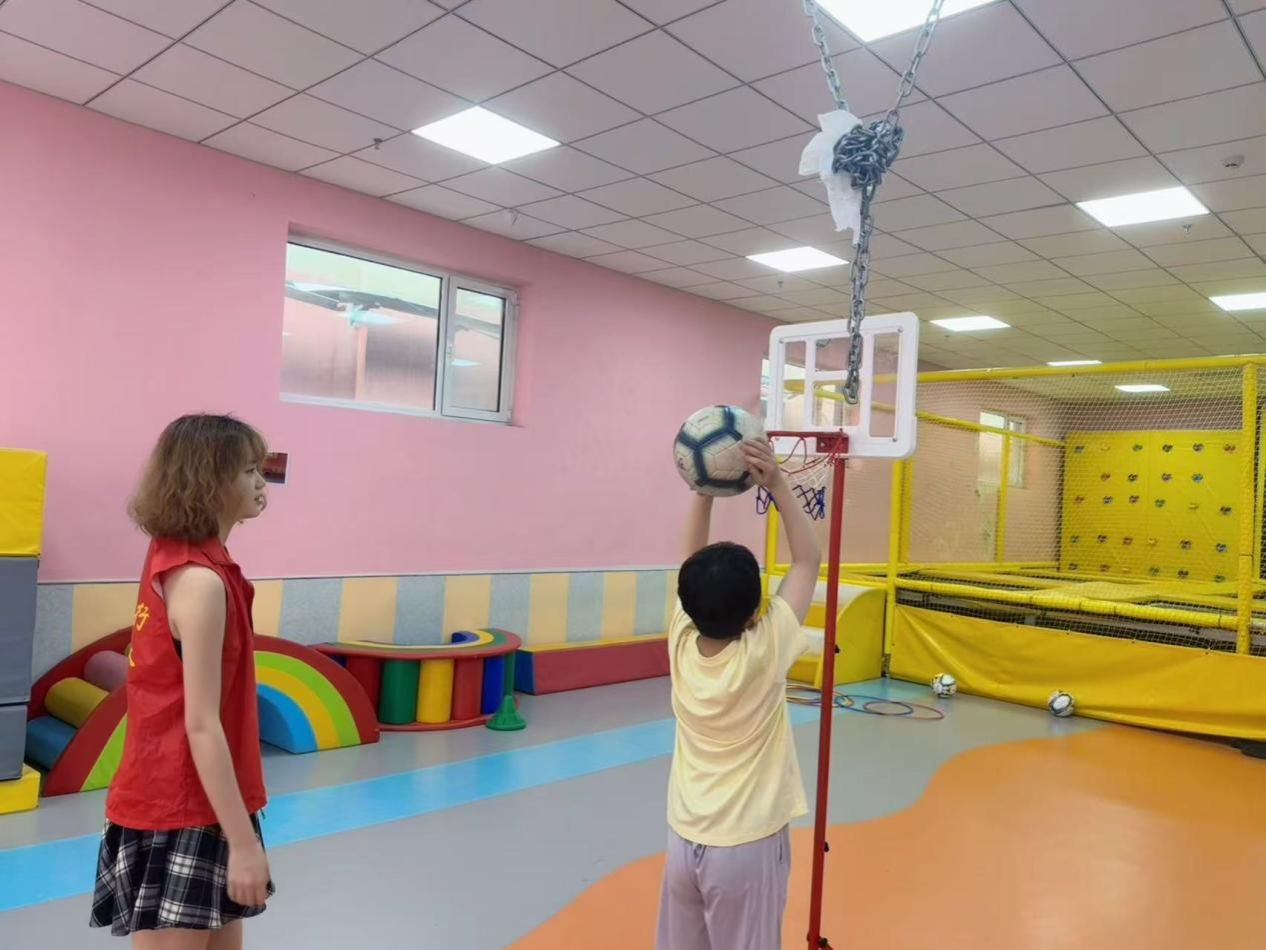 康复中心的室内运动场,是孩子们活力释放的乐园。孙继佳与孩子们围聚在一起,开启了特别的体育课。篮球在地面上跳跃,每一次弹起都伴随着孩子们的笑声。孙继佳耐心地示范着投篮动作,手把手帮助孩子们调整姿势,鼓励他们勇敢尝试。对于一些平衡能力较弱的孩子,孙继佳会放慢节奏,扶着他们的肩膀,陪着他们慢慢移动脚步,引导他们感受篮球在空中划过的弧线,在运动中锻炼平衡能力。在汗水与欢笑交织中,孩子们逐渐掌握了篮球的小技巧,他们的眼神中闪烁着自信与快乐,小小的身躯在运动场上充满了力量。