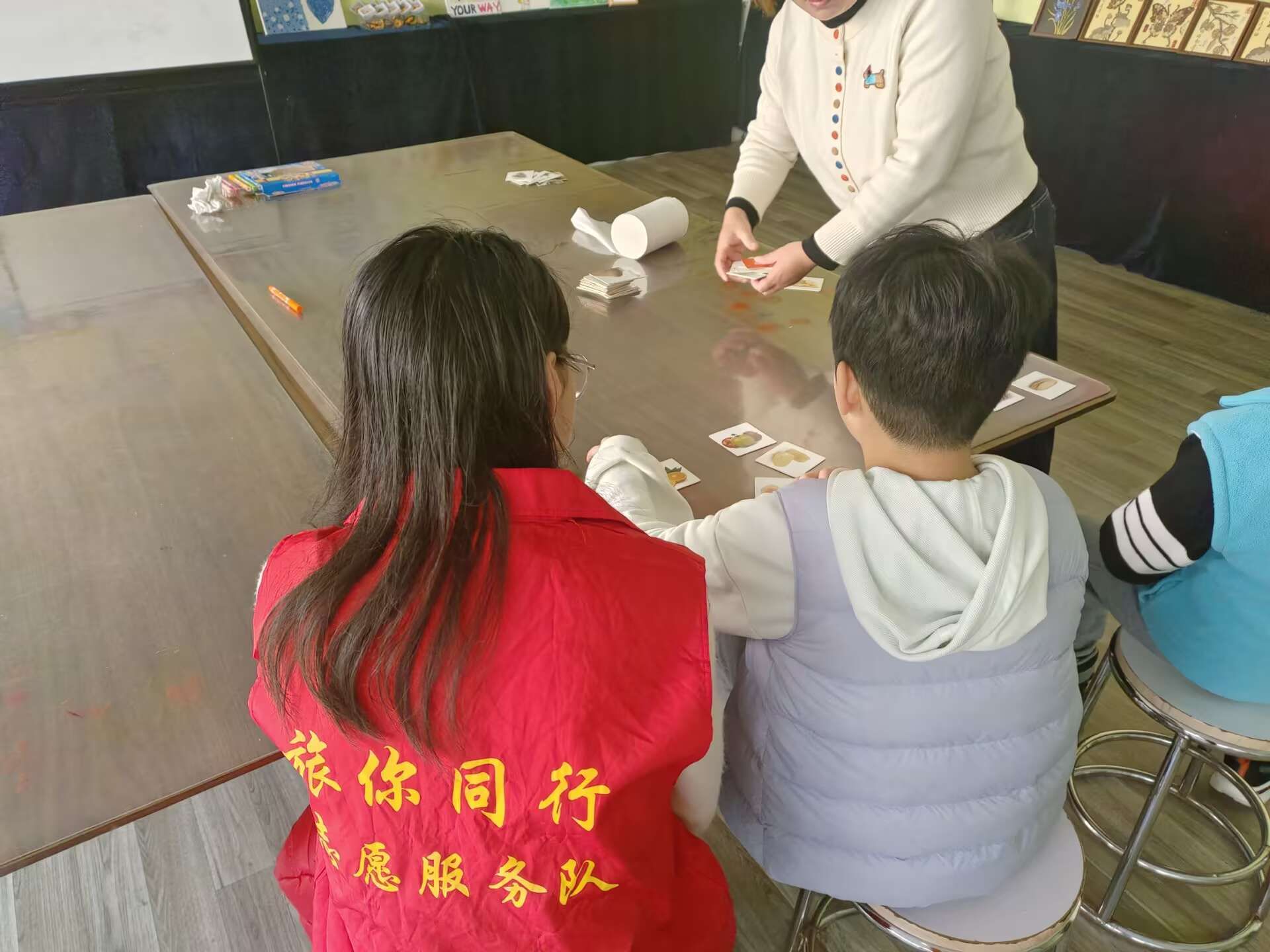 告别刻板的教学模式,志愿者们化身“童心引路人”,带着色彩斑斓的教具走进课堂。数字与图形不再是枯燥的符号,而是通过趣味问答、情景模拟变得鲜活起来;看图识物卡片上的动物、水果与生活用品,在志愿者耐心的引导下,成为孩子们认识世界的窗口。“孩子们专注的眼神里,藏着对未知的好奇,也让我们读懂了陪伴的意义。”志愿者许莉的话语里满是动容。在轻松愉悦的氛围中,知识悄然萌芽,信任慢慢滋生,每一次回应都是心与心的靠近。