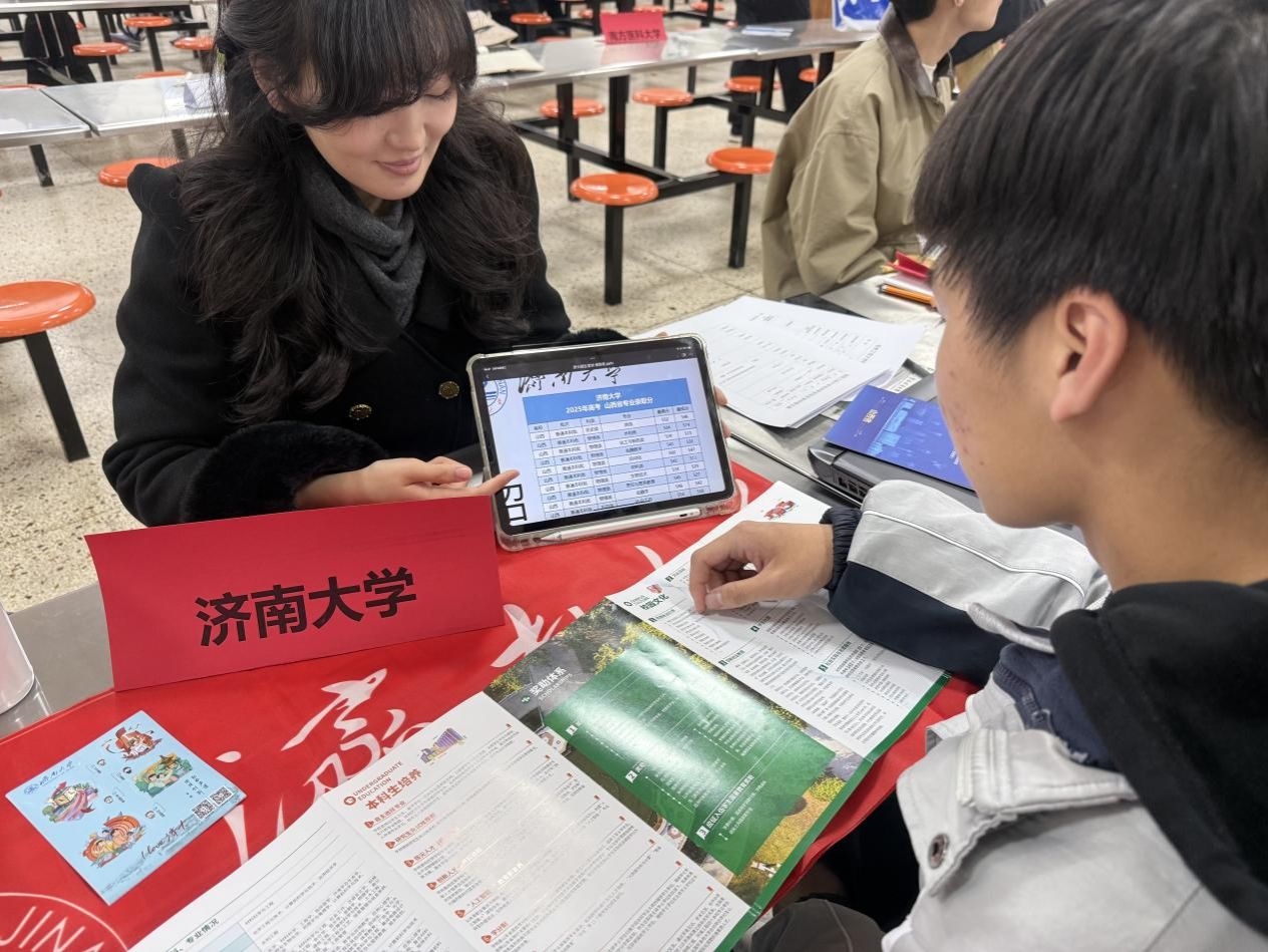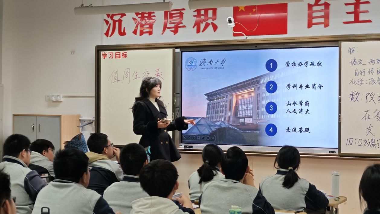 的办学底蕴、学科实力与招生情况。她将数据融入自己的大学成长体验,分享了图书馆的伏案时光、社团活动的欢声笑语,让济大生活变得真实可感。互动环节中,她耐心解答同学们关于专业选择、校园生活的疑问,并留下联系方式以便后续交流。