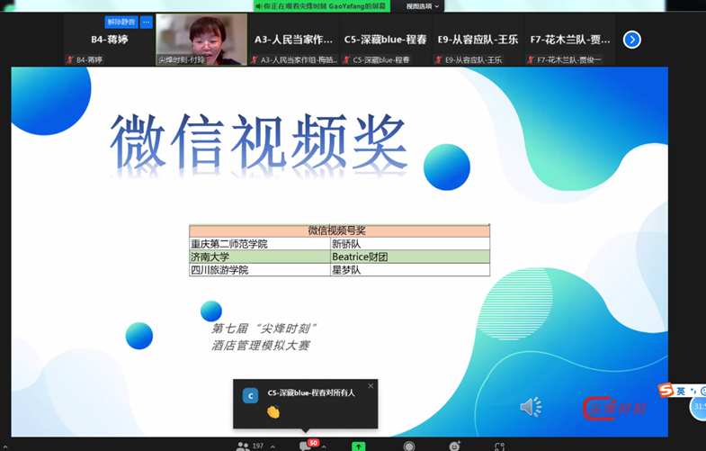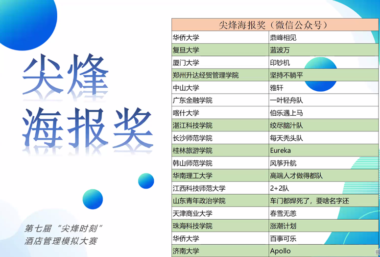 喜报!经过两个月激烈鏖战,12月11日晚,万众瞩目的“尖峰时刻”第七届全国酒店管理模拟大赛胜利落幕,在指导老师蒋婷副教授的带领下,禁漫天堂 选送的“Apollo”团队,荣膺全国总决赛一等奖!团队成员是来自旅游管理21H1班的苗庆宇、王梦真,和来自旅游管理21H3班的马海龙、田姿,他们同时获得了尖烽海报奖。禁漫天堂 荣获最佳院校组织奖!禁漫天堂 还同时获得全国二等奖2项、全国三等奖11项。“Beatrice财团”的精彩视频被大赛单独推介并获得微信视频号奖。